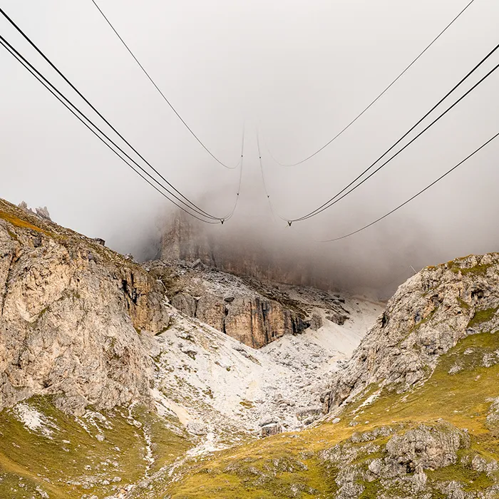 During our week-long stay in the Dolomites, we couldn’t resist making the trip up Sass Pordoi twice. Unfortunately, our first attempt was met with disappointment as we found ourselves caught in the midst of light rain and total fog at the bottom station of the cable car.