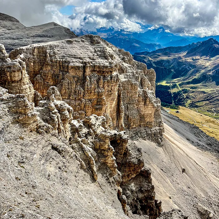 From the top of Col Rodela, we hiked down to the Dolomiti Mountain Resort Hotel, where we enjoyed a delicious meal and more incredible views of Sassolungo from the other side. But what truly captured our hearts were the starting points of several trails leading to the foot of the limestone needles, offering the perfect day hike for any adventurer. You can choose to loop around one or both parts of the towers or hike up the Forcella del Sassolungo to the Rifugio Toni Demetz. And if you’re looking for a unique experience, you can even reach this area by the Forcella Sassolungo cable car.